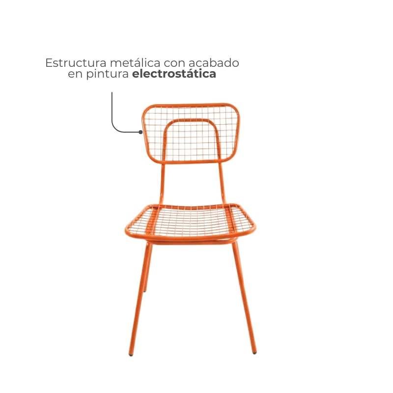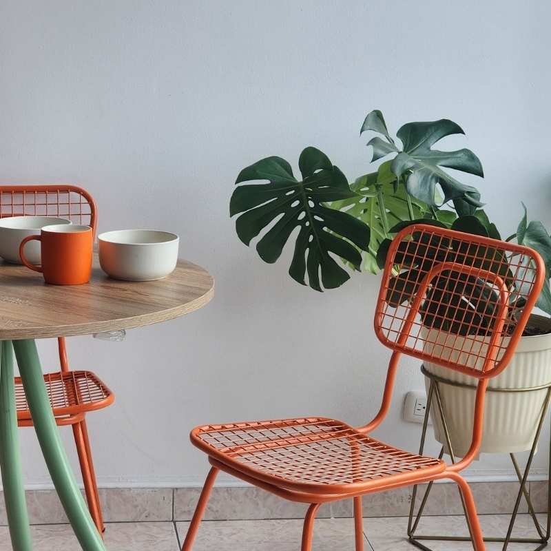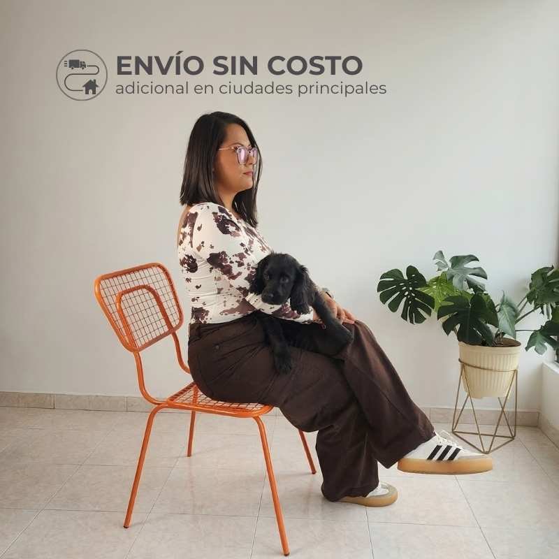Silla de comedor pet friendly con diseño retro, pensada para hogares donde las mascotas también hacen parte del día a día. Su estructura metálica resistente ayuda a evitar daños por rasguños o mordiscos curiosos y, a diferencia de otros materiales, no retiene pelos, lo que la hace mucho más fácil de limpiar🐕🐈